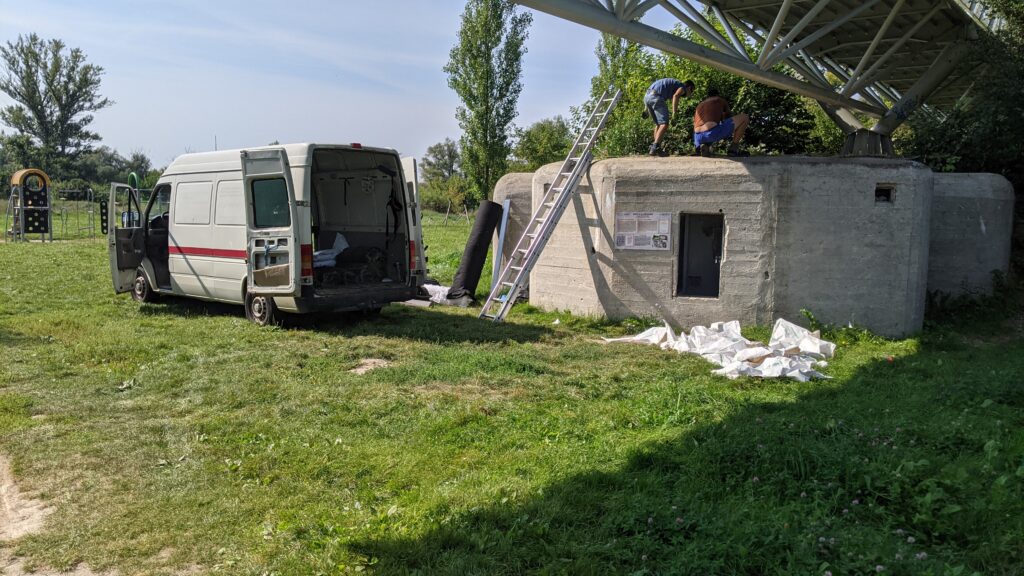 V roku 2019 sme začali s obnovou bunkra s podporou Bratislavského samosprávneho kraja (BSK) a v partnerskej spolupráci Školy úžitkového priemyslu Josefa Vydru v Bratislave. Projekt pozostával z dvoch častí. Prvá pozostávala so súboru prác akými boli vyčistenie a odvoz odpadu z interiéru, dezinfekcia a vnútorný náter bielou a sivou farbou (vstupná chodba), očistenie stropu, obkopanie bunkra, osadenie mreže, odstránenie kovového rebríka, vyplnenie vonkajších rýh na fasáde bunkra.